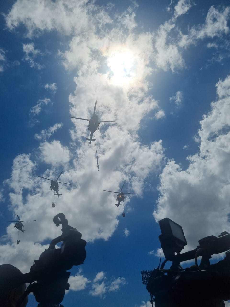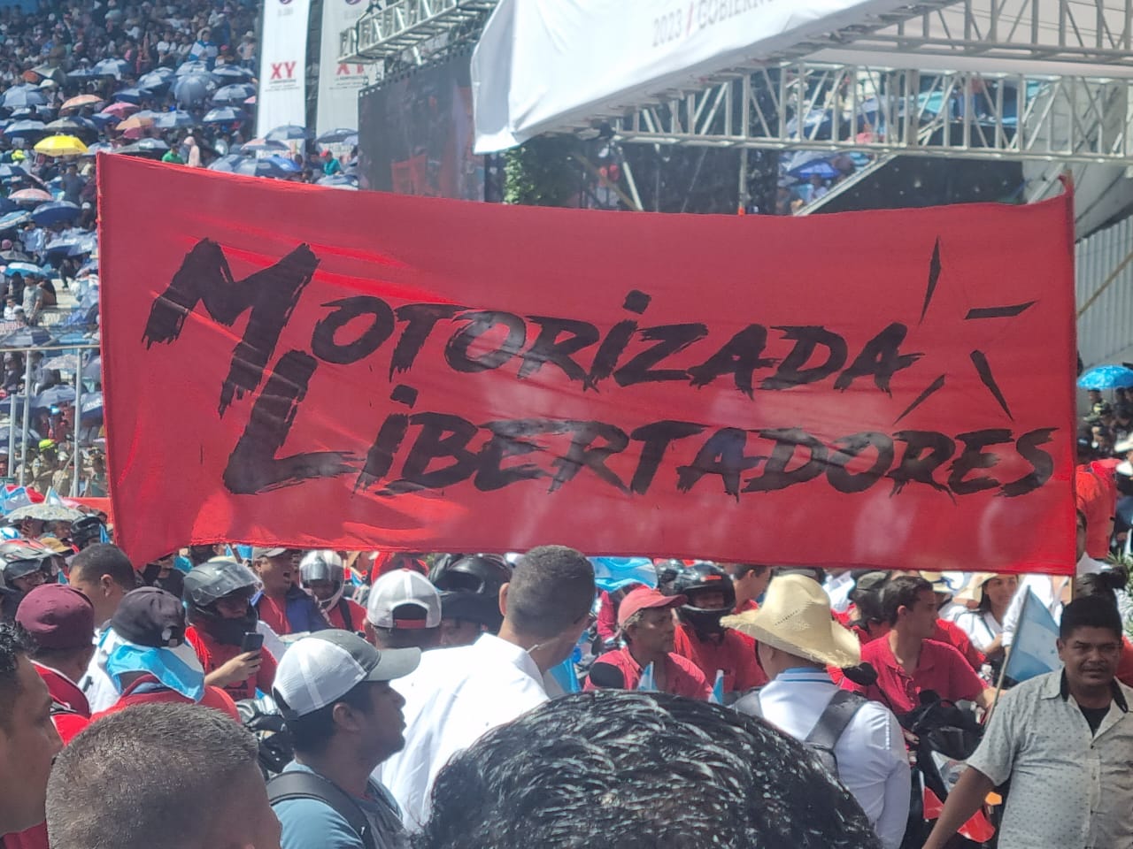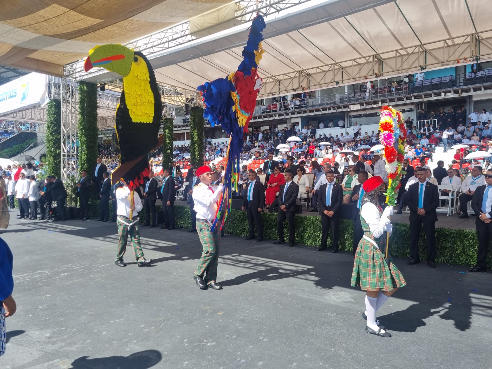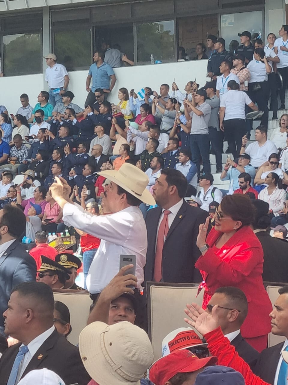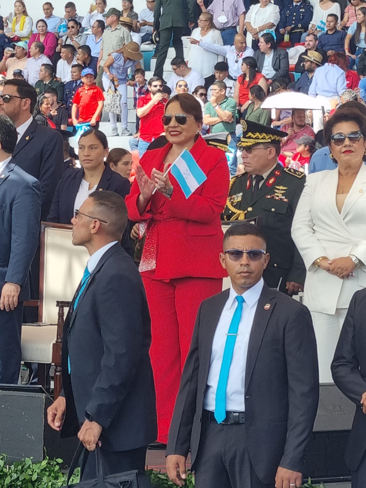 En el estrado principal la presidenta Xiomara Castro, recibe el saludo y las reverencias de cada centro educativo. Se la ve acompañada del presidente del Congreso Nacional, Luis Redondo y de la presidenta de la Corte Suprema de Justica, Rebeca Ráquel Obando.
