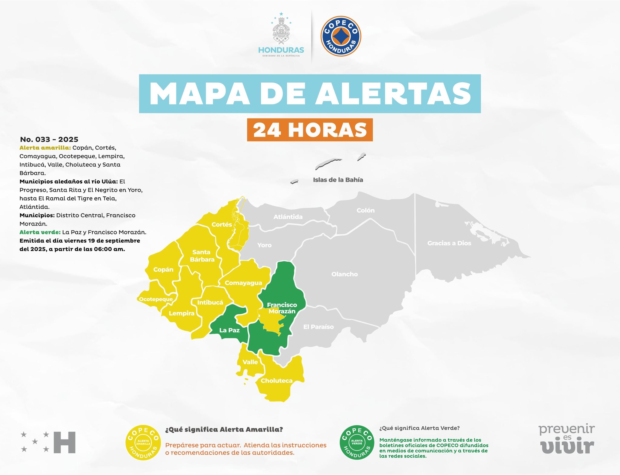 Se extiende la Alerta Verde para los departamentos de La Paz y Francisco Morazán por un período de 24 horas, a partir de las 6:00 a. m. del viernes 19 de septiembre de 2025.