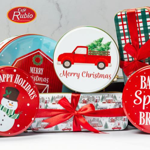 Con vasos, botes y cajitas de lata con temáticas de navidad Café Rubio y Del Bosque ofrecen creativos regalos para la temporada navideña.
