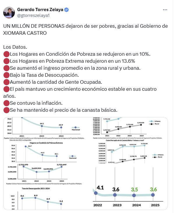 Torres compartió en su cuenta de X que los hogares en condición de pobreza disminuyeron un 10%, mientras que los que vivían en pobreza extrema cayeron un 13.6%. Además, destacó que el ingreso promedio aumentó tanto en áreas urbanas como rurales, y que la tasa de desocupación descendió, incrementando la cantidad de personas con empleo.